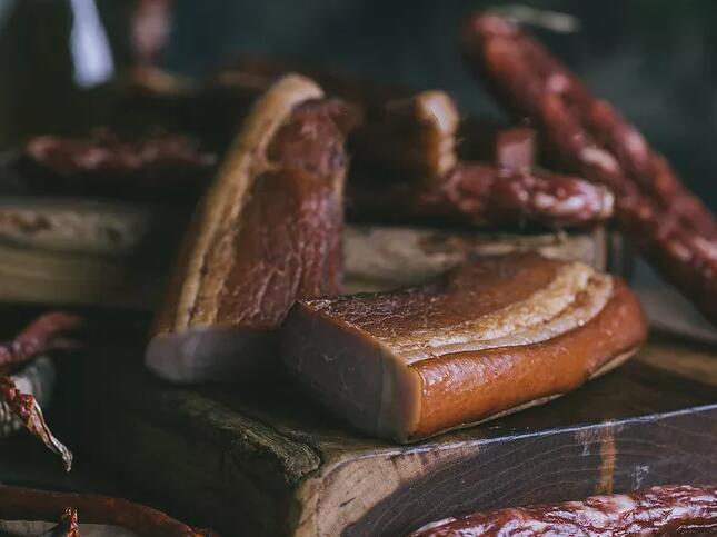 2、臘肉選用新鮮的帶皮五花肉,分割成塊,用鹽和少量亞硝酸鈉或硝酸鈉、黑胡椒、丁香、香葉、茴香等香料腌漬,再經(jīng)風(fēng)干或熏制而成,具有開胃祛寒、消食等功效。
